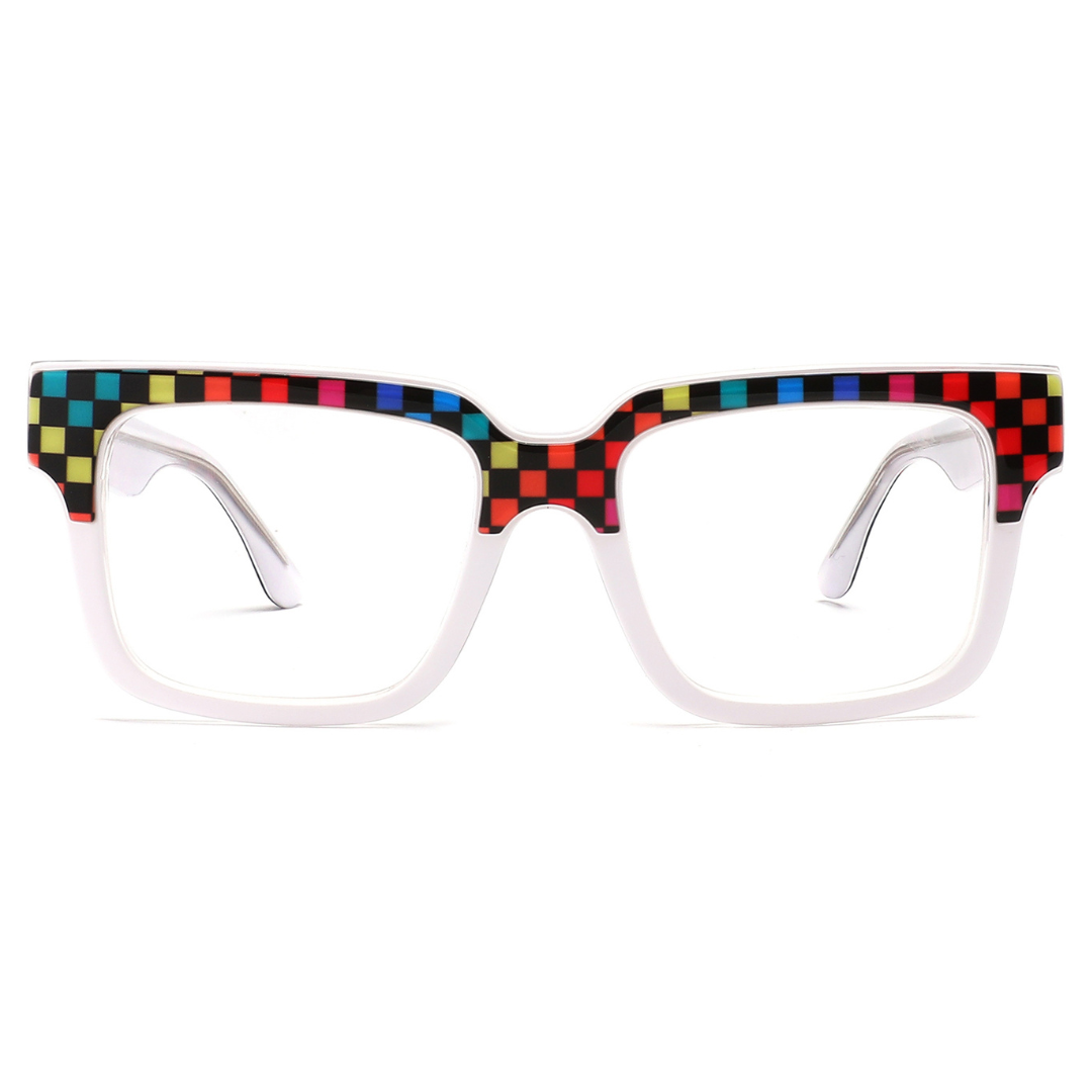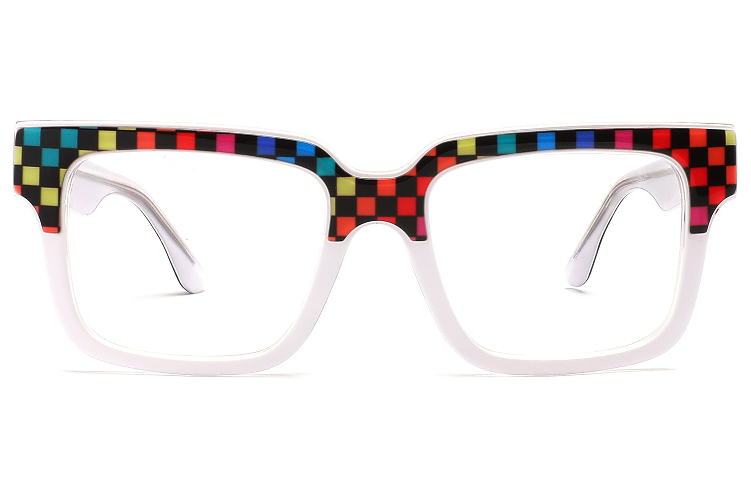 These oversized eyeglasses are crafted from durable acetate, featuring a playful checkered pattern across the top bar. The combination of a white frame and colorful accents adds a dynamic and modern touch to the design. The five barrel hinge ensures durability and comfort for everyday wear.