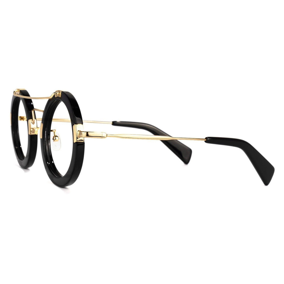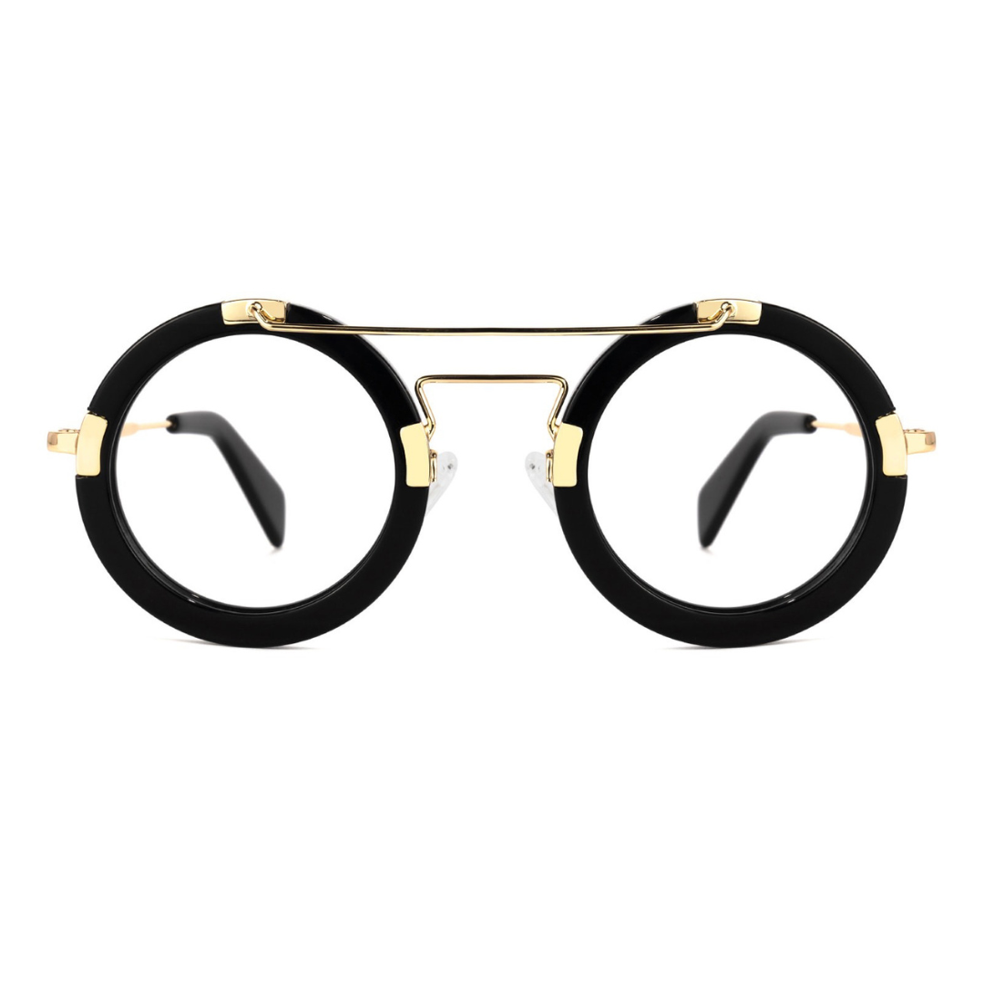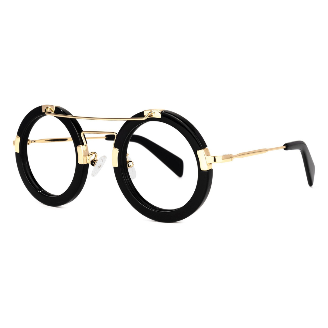 These striking eyeglasses feature a bold design that combines high-quality plastic with sleek metal elements. The round, black plastic frames are complemented by gold metal hinges and detailing, creating a classic yet contemporary look. The unique structure includes a distinct metal bridge and accents that highlight the craftsmanship and attention to detail.