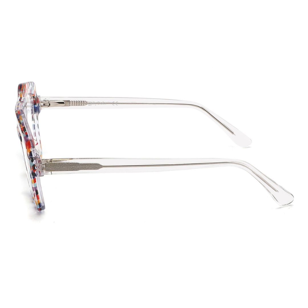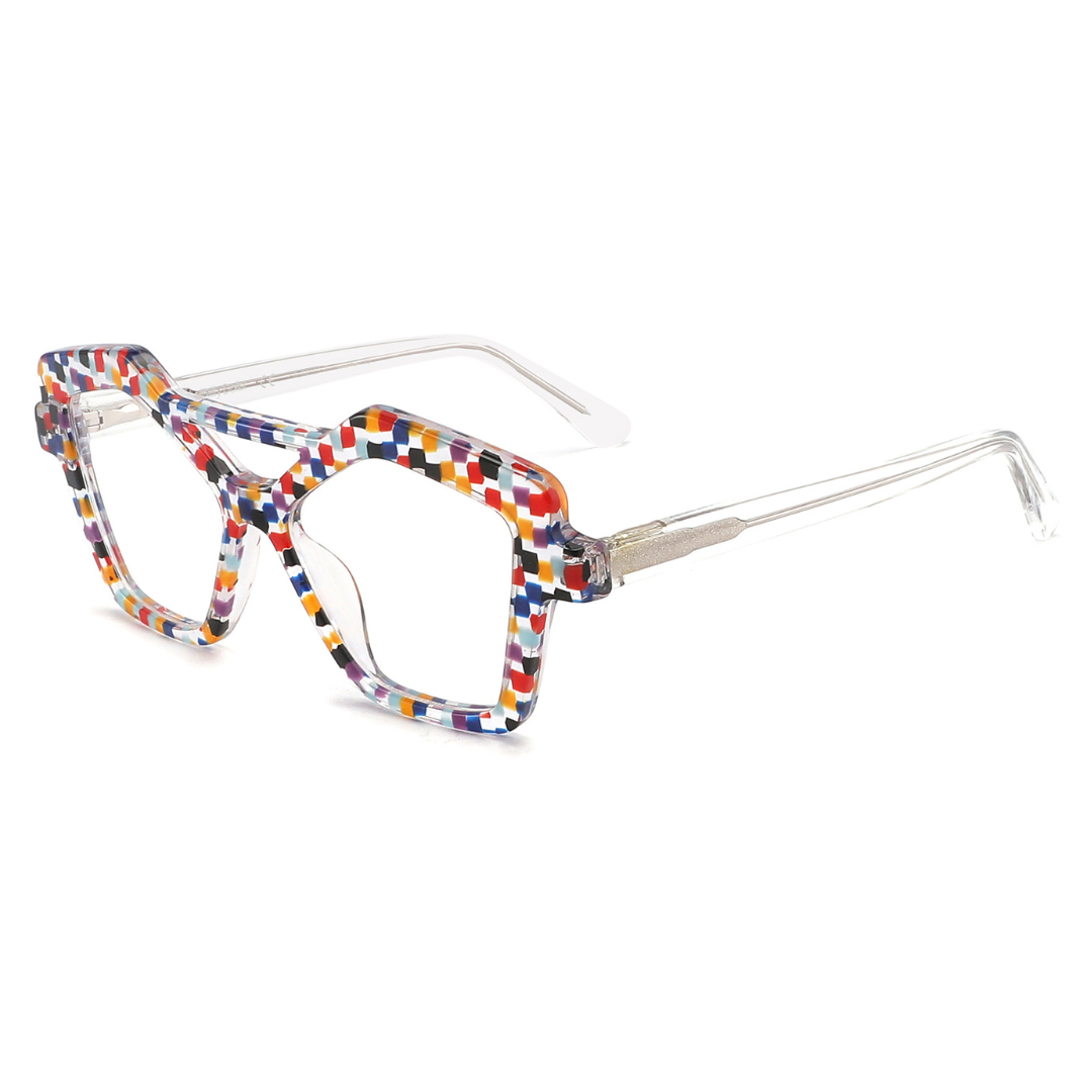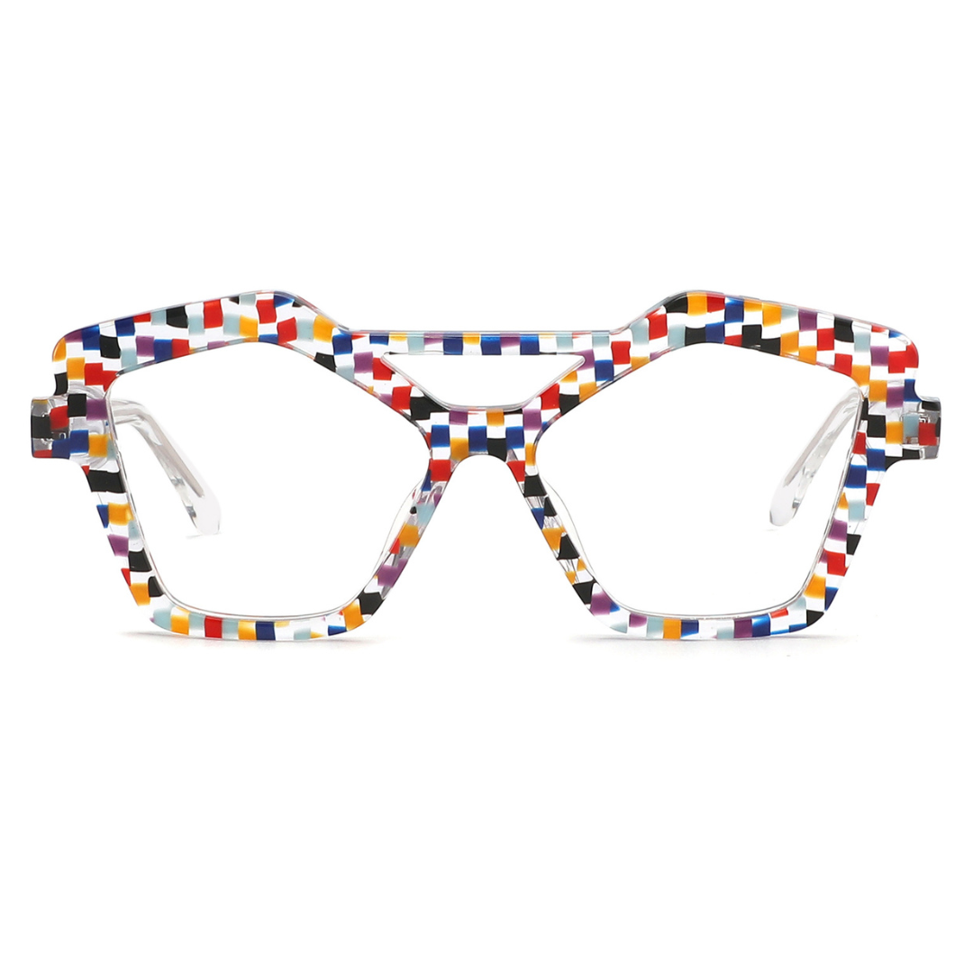 These bold and vibrant eyeglasses are crafted from high-quality acetate, showcasing a unique multicolor checkered pattern that exudes creativity and individuality. The geometric design is further enhanced by the inclusion of spring hinges, providing flexibility and a secure fit for daily comfort.