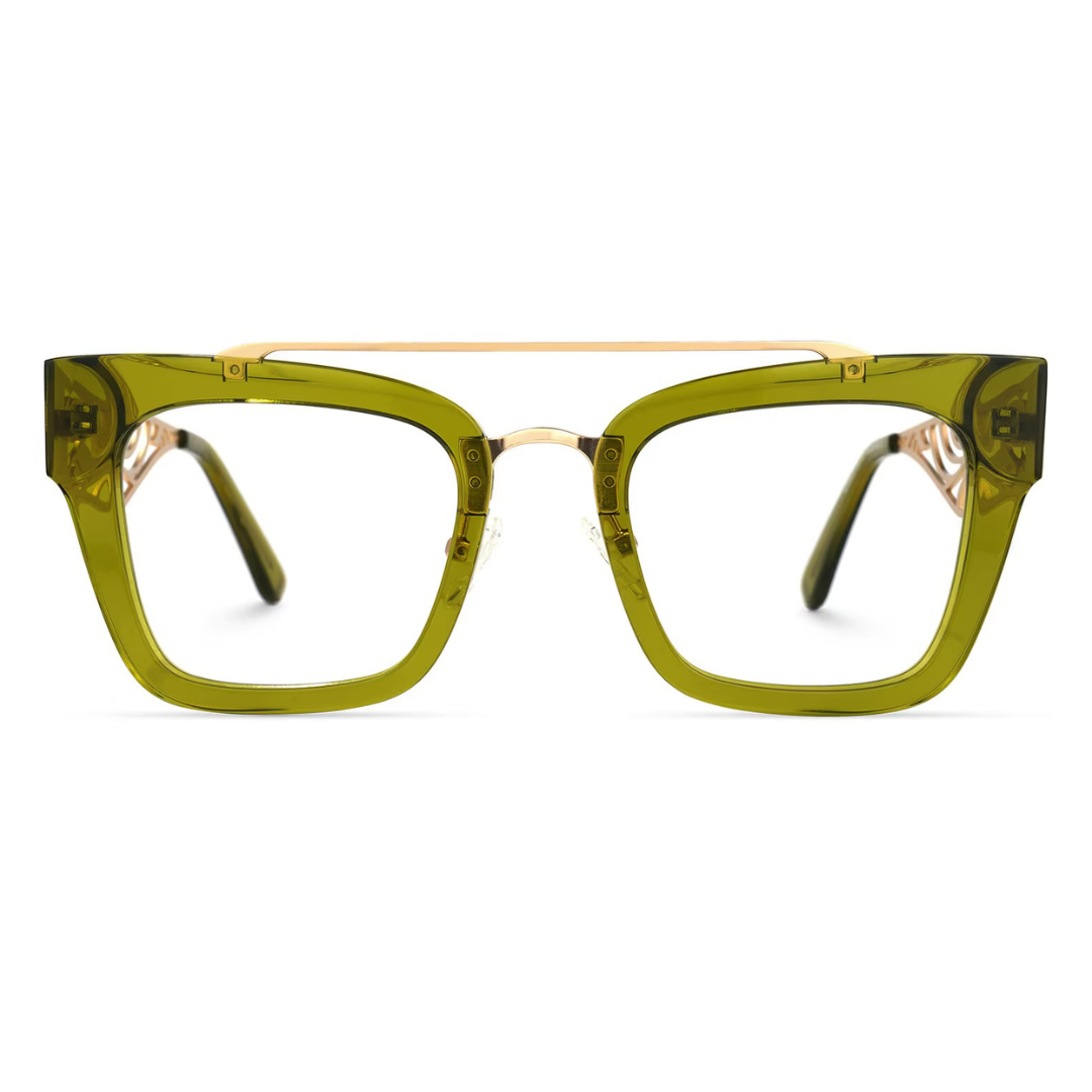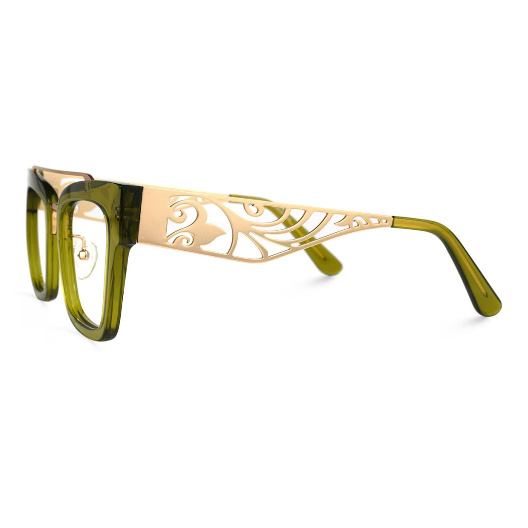 These eyeglasses are a fusion of vibrant green plastic and golden metal, offering a bold and sophisticated look. The rectangular frames are accented with a sleek metallic top bar and hinge details, providing a contemporary edge to a classic design.