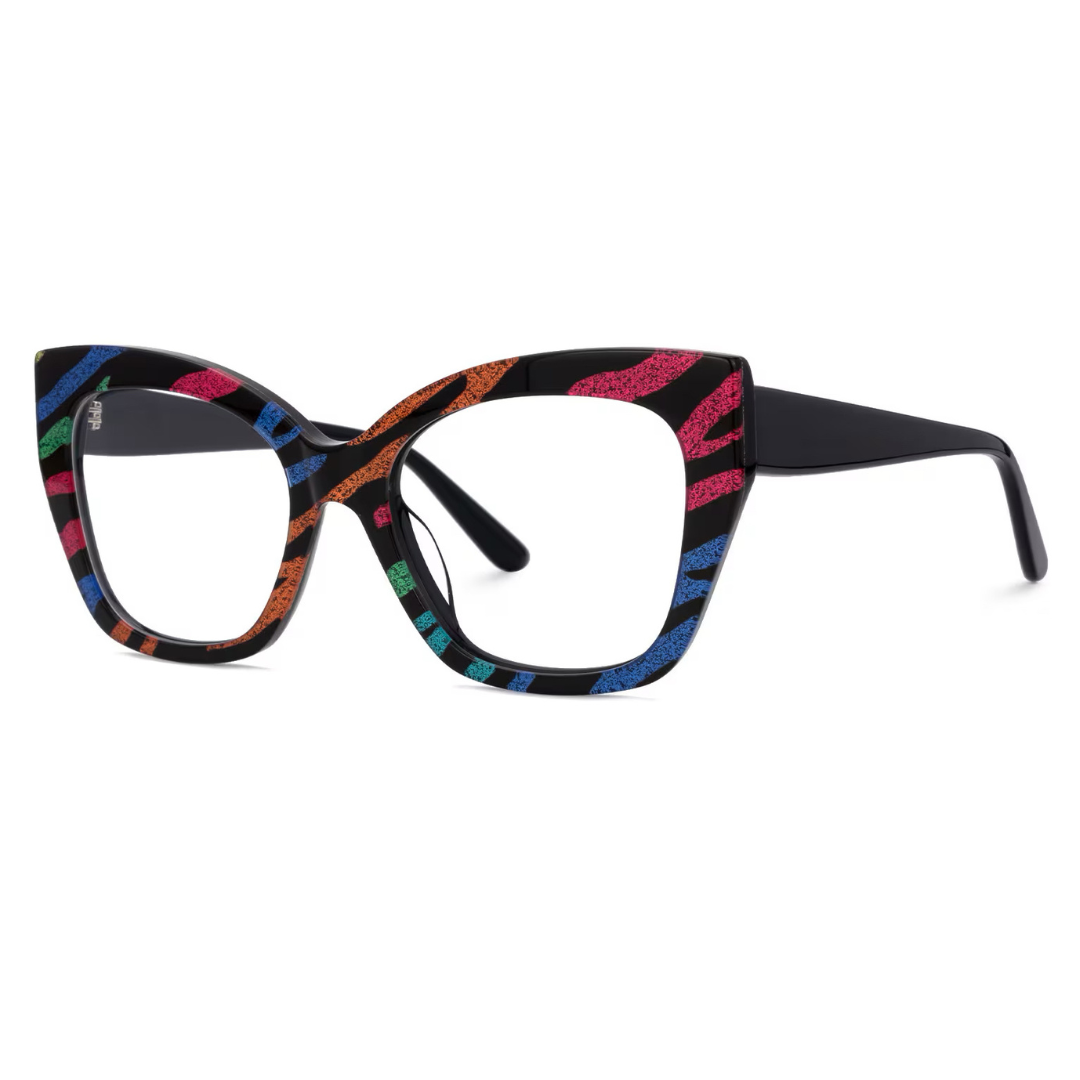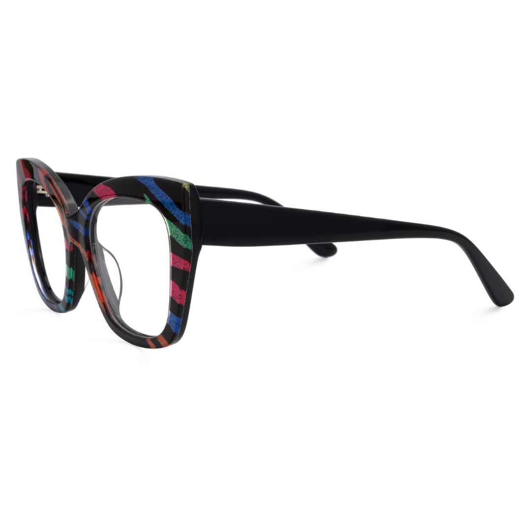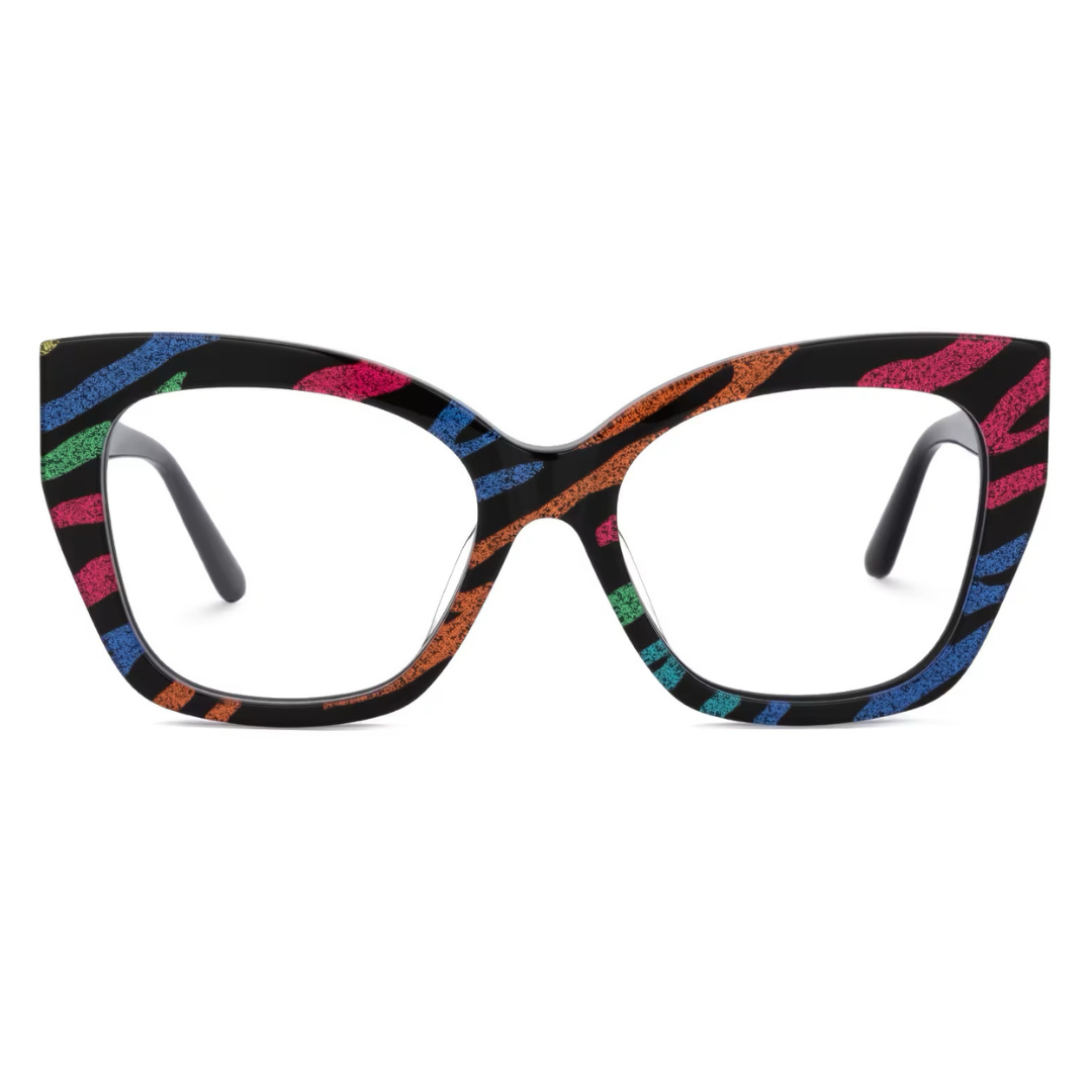 These striking eyeglasses are fashioned from high-quality acetate and feature a bold, multicolored pattern that sets them apart from the ordinary. The frames are equipped with a robust five-barrel hinge, ensuring durability and reliable performance. The vivid splashes of color integrated into the frame design make these glasses a perfect statement piece for those looking to express their unique style.