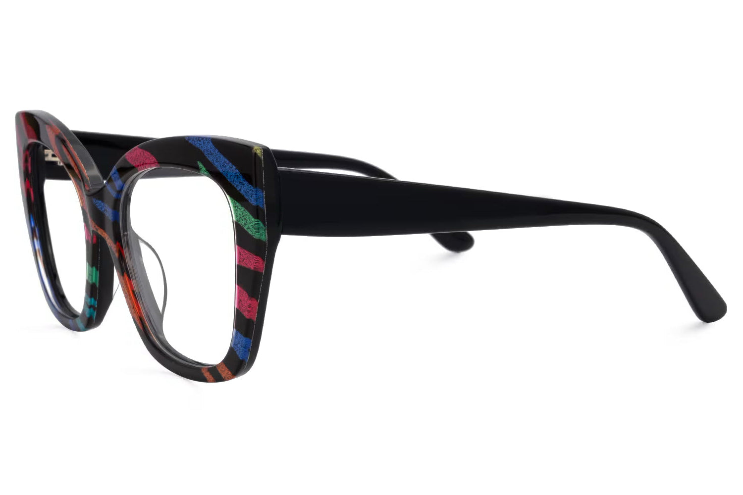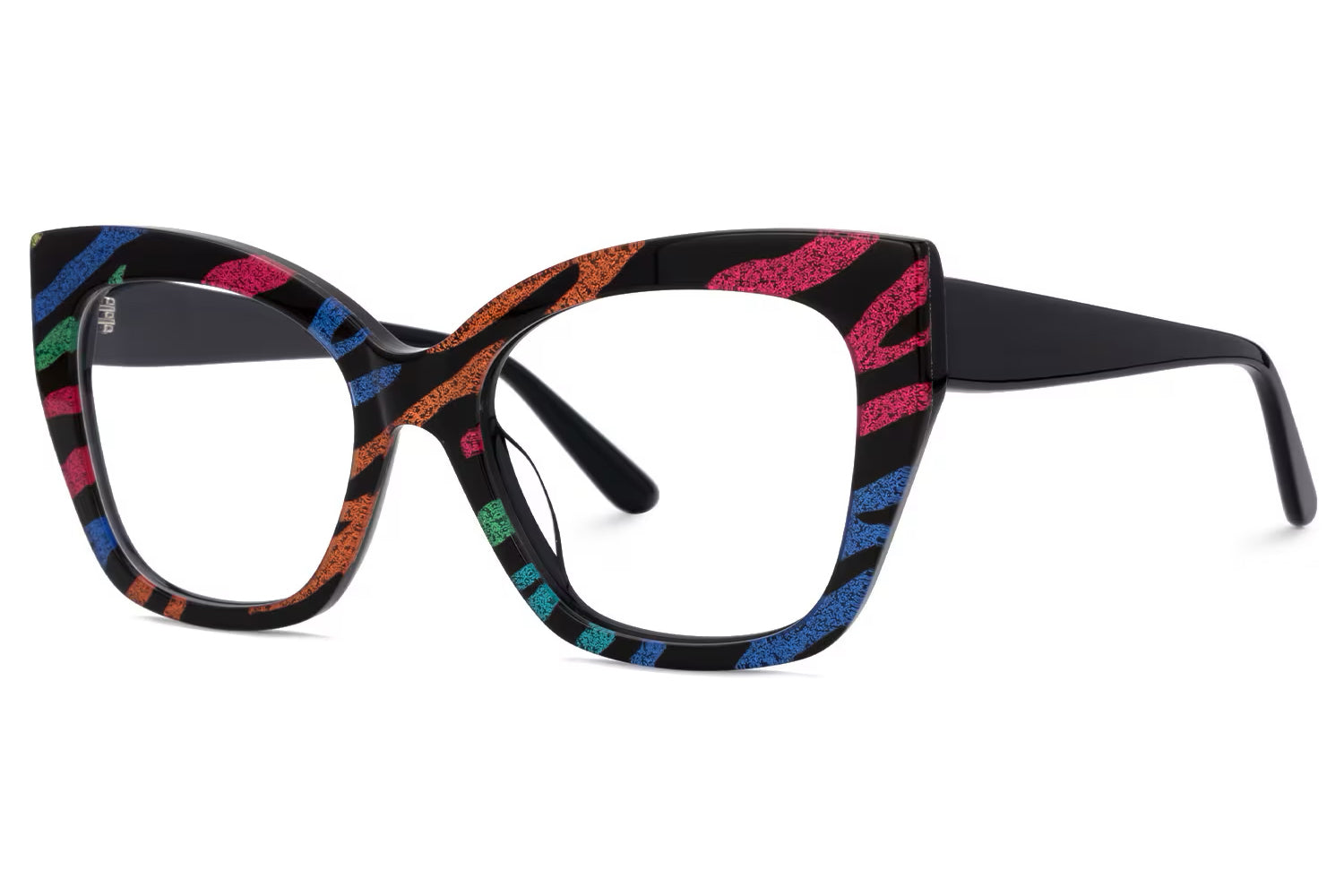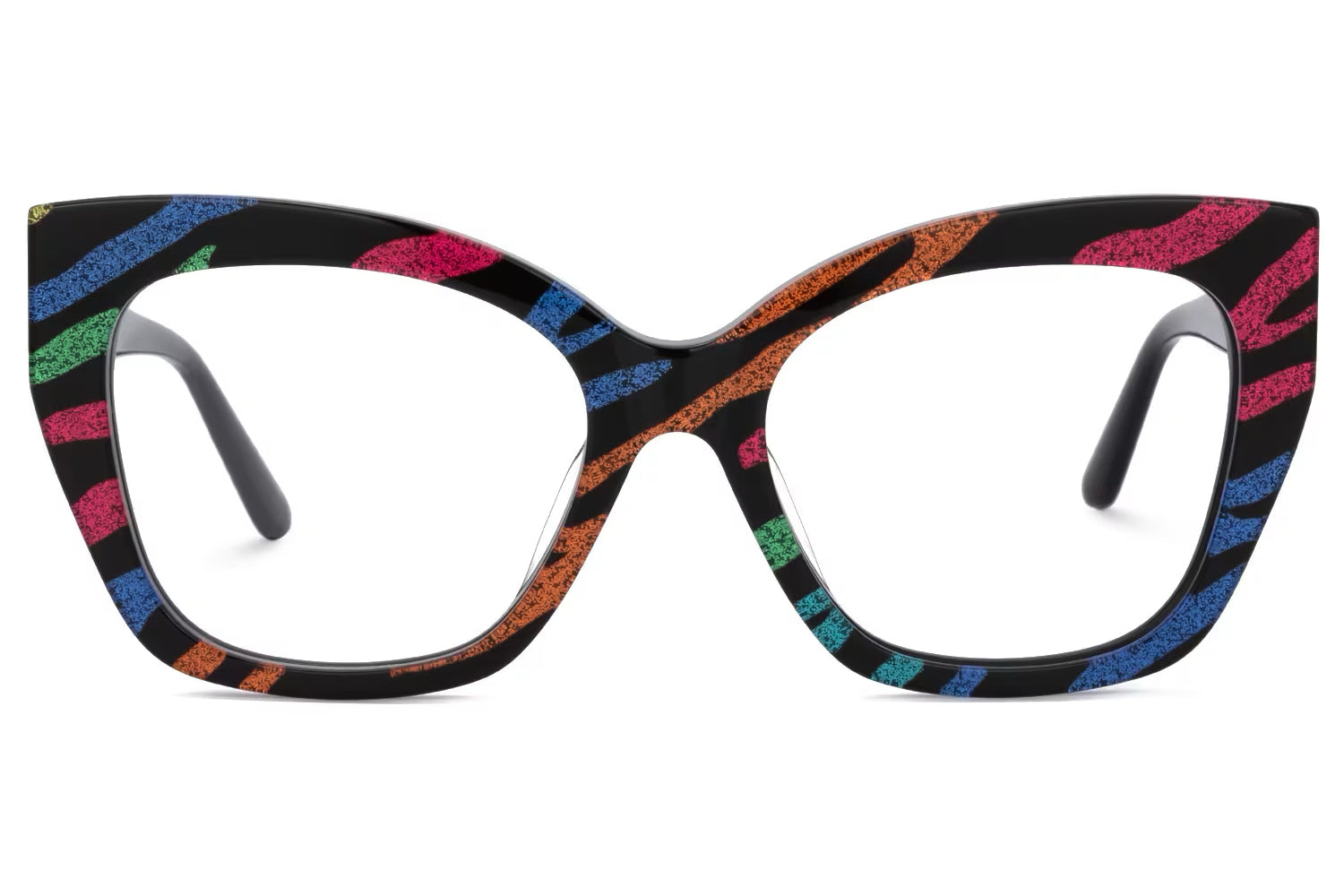 These striking eyeglasses are fashioned from high-quality acetate and feature a bold, multicolored pattern that sets them apart from the ordinary. The frames are equipped with a robust five-barrel hinge, ensuring durability and reliable performance. The vivid splashes of color integrated into the frame design make these glasses a perfect statement piece for those looking to express their unique style.
