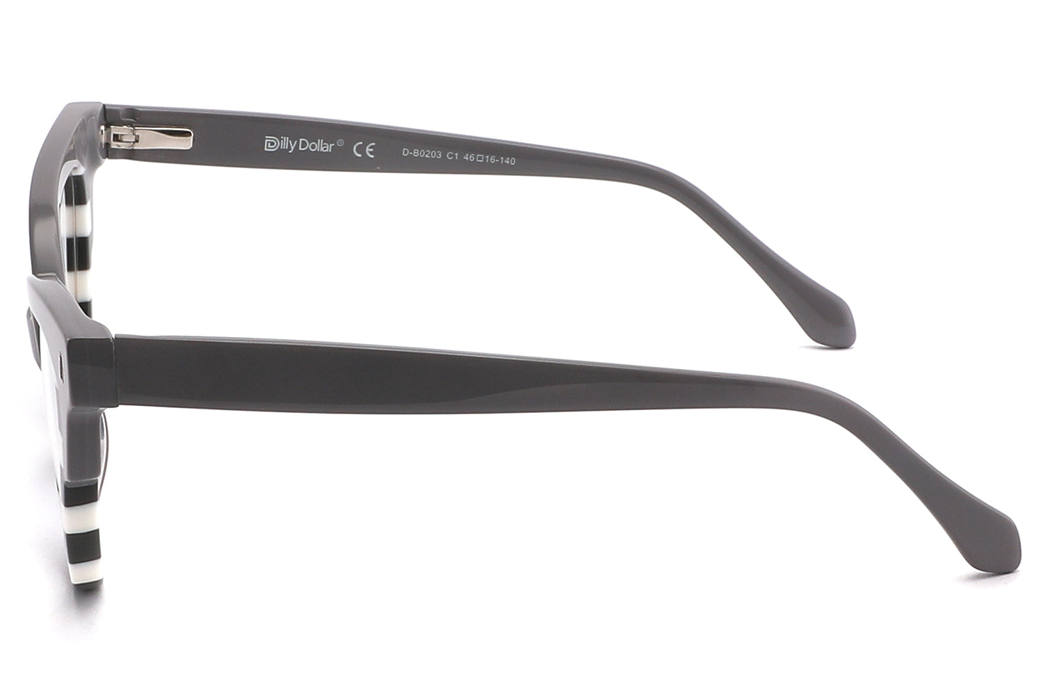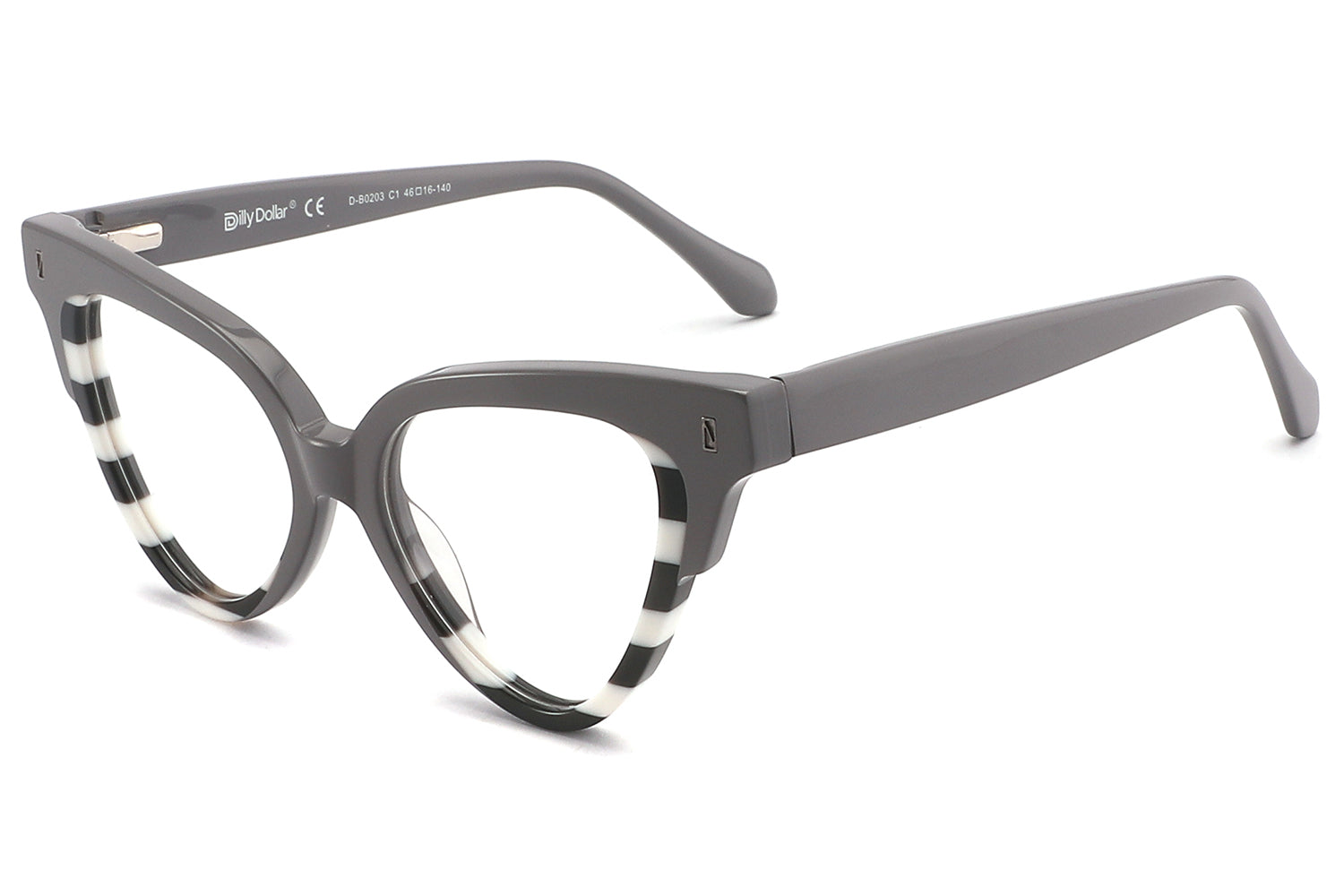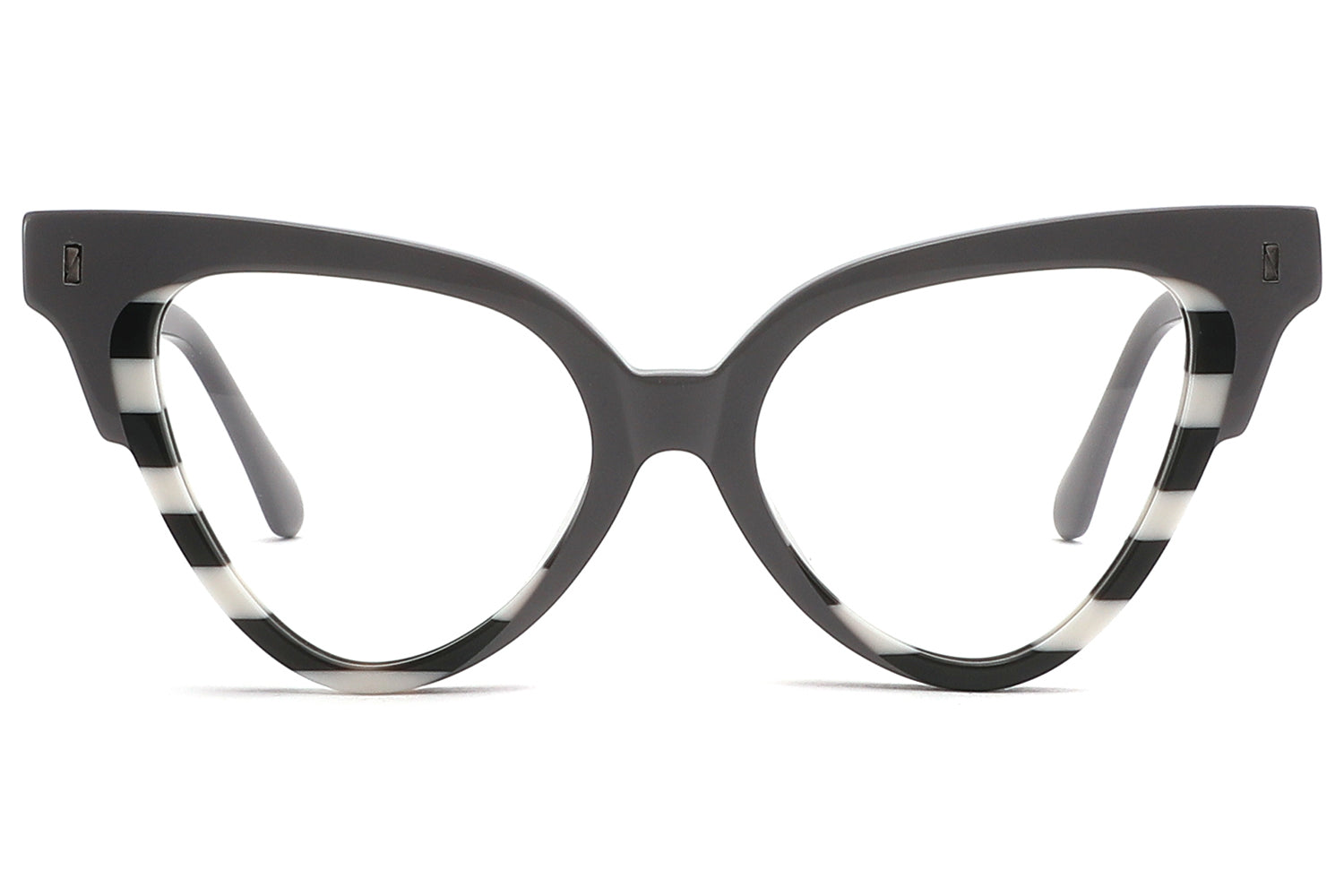 These modern cat-eye glasses combine elegance and bold design, crafted from high-quality acetate. The sophisticated grey frame is highlighted with striped black-and-white detailing on the lower edges, creating a distinctive and stylish look. The spring hinge mechanism ensures flexibility and comfort for prolonged wear.