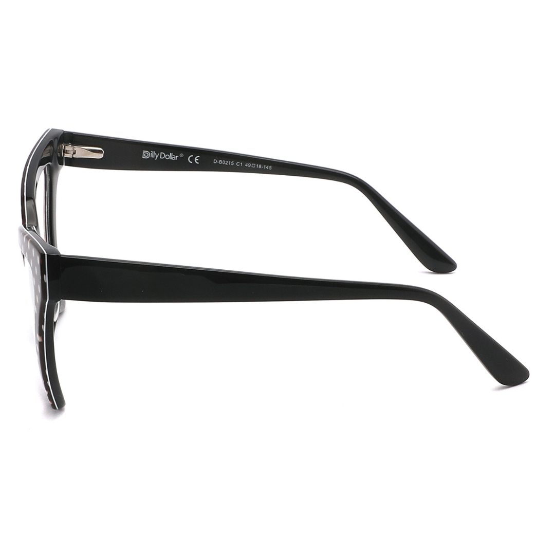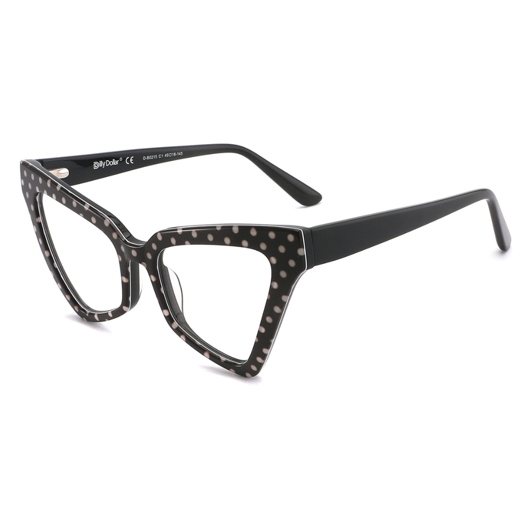 These stylish eyeglasses are crafted from premium acetate, featuring a bold black frame adorned with playful polka dots. The unique cat-eye design adds a touch of vintage charm, while the spring hinges ensure a comfortable and secure fit.