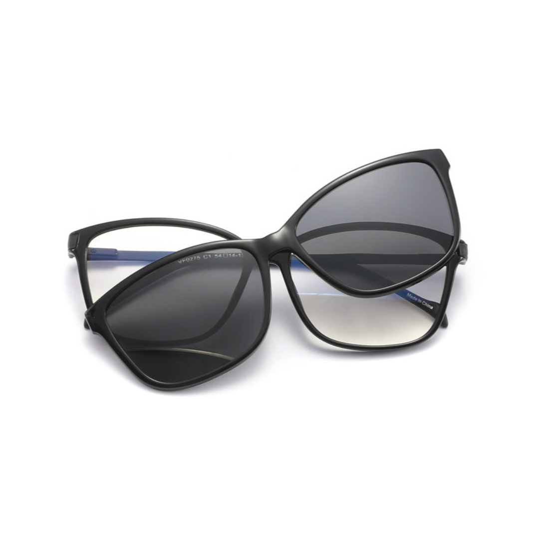Turn heads with this elegant butterfly-shaped clip-on frame that effortlessly combines fashion and functionality. Designed with lightweight TR90 and IP-plated temples, this eyewear offers a sleek look with the convenience of a built-in sun protection solution.