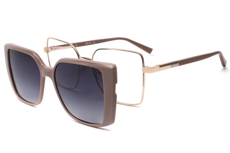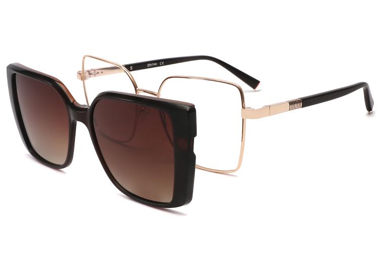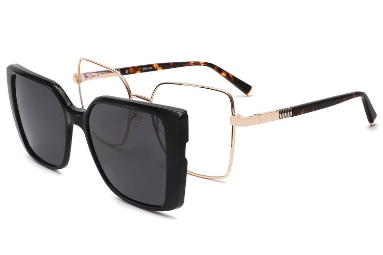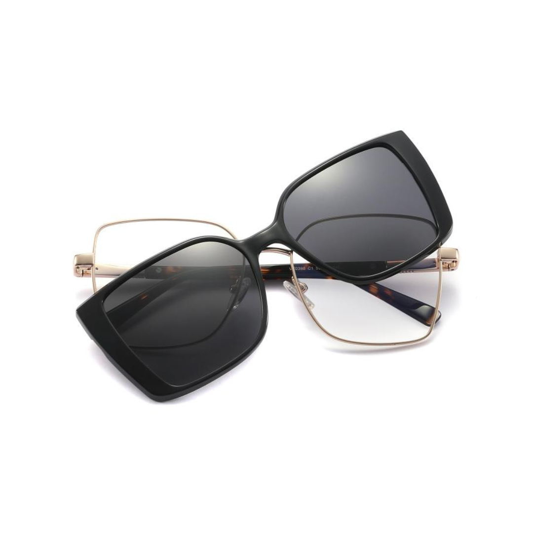 - Design: Classic square silhouette paired with a functional clip-on for added convenience.